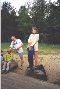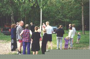 1999 var som programmet afslørede - lagt i stramme tøjler med "spejderagtig" tidsplan og kommandolinie. Lejrchef Jørgen Madsen har samlet familien til flaghejsning og sang. |