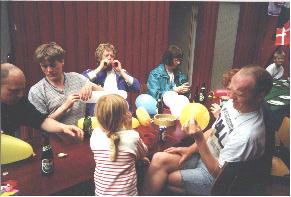 | Lene er i færd med at instruerer holdene i reglerne for årets underholdning, som skulle bestå i en fremførelse af klodshans på forskellig vis, bla som opera, mimik, drama og ballet. Ved fremførelsen brillierede især Mads, som havde 3-4 roller. Mads syntes nu også at JensM var den bedste ged!! |