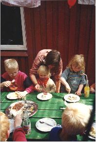 | Endelig kage. Bagefter var der gaver og pakkespil. Sidstnævnte blev til hyleri, da nogle af børnene måtte aflevere nogle af de gaver de havde vundet,da andre havde været mindre heldige. Den var jo noget svært at sluge!!!!! |